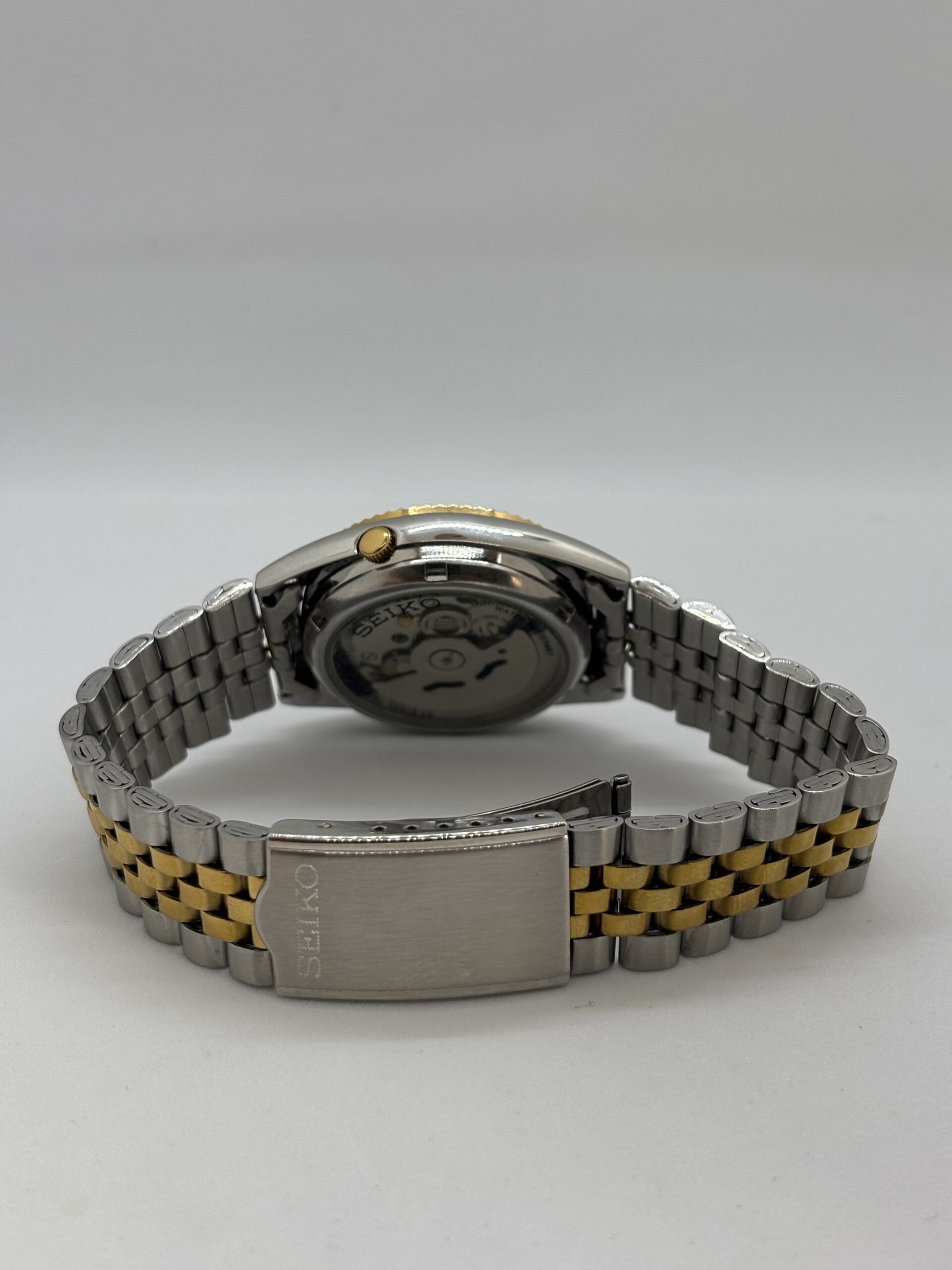 Seiko SNXJ90 Great for those who appreciate rare and vintage style watches with a very modern touch I built a SNXJ90 automatic men’s watch mod. It holds a 7S26 movement which is considered a workhouse build to last for a lifetime. The two tone color settings in together with the silver sunburst dial is a stunning combination. This all put together in the an homage case to that of the Seiko SNXJ series. Please note that the caseback is see through and is used before. Ask for pictures if interested.